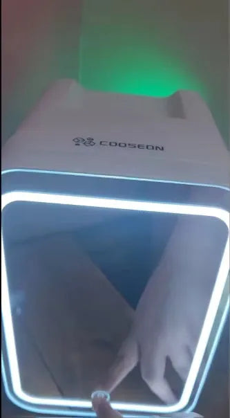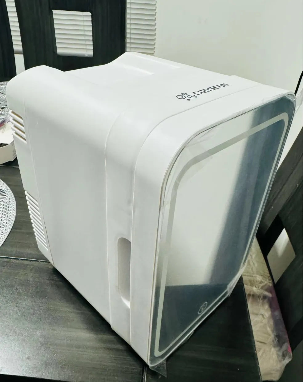 "OMG, this mini fridge is a game-changer for my skincare routine! I love how my creams and serums stay cool and fresh. The mirror on the door is perfect for quick touch-ups. It's super sleek and fits perfectly on my vanity. Totally worth it!πŸŽ‰πŸ’„"